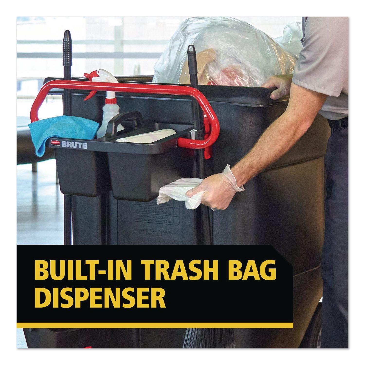 This retrofittable ergonomic handle supports day-to-day tasks and features a removable caddy for easy dumping. The caddy includes two integrated stick good holders for quick tool access and a built-in trash bag dispenser to keep supplies organized on the go. Designed with user comfort in mind, the handle helps reduce strain while maintaining control during transport. Ideal for busy shifts, it keeps essential tools and materials within reach to maximize efficiency.
