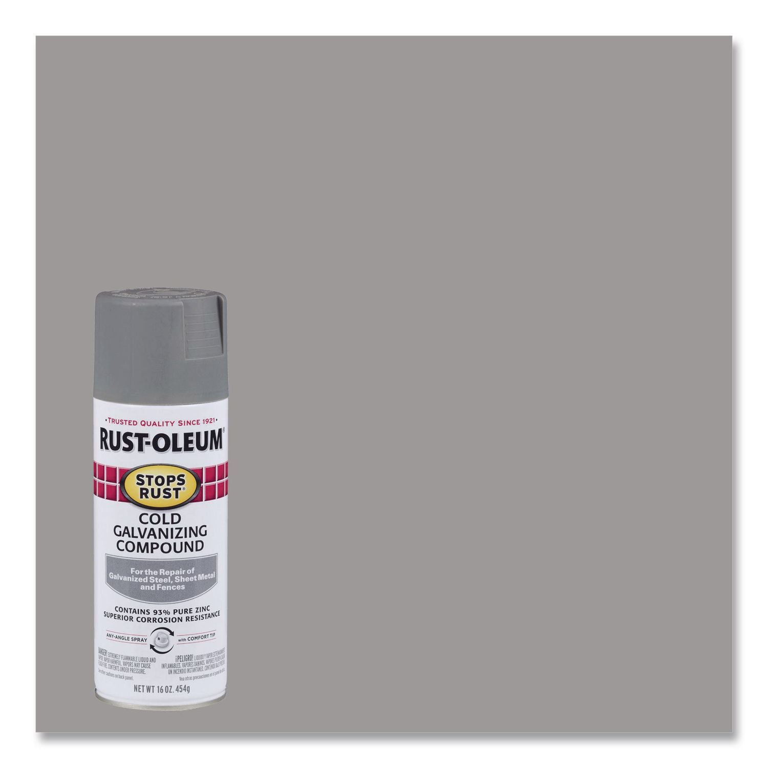 Rust-Oleum® Stops Rust® Cold Galvanizing Spray provides maximum corrosion resistance through galvanic protection. Use for touch-up and repair to damaged galvanized steel, galvanized ducts, fences, gutters, trucks, trailers and more. Do not topcoat with an alkyd finish. Cold Galvanizing Spray contains 93% zinc in the dry film.