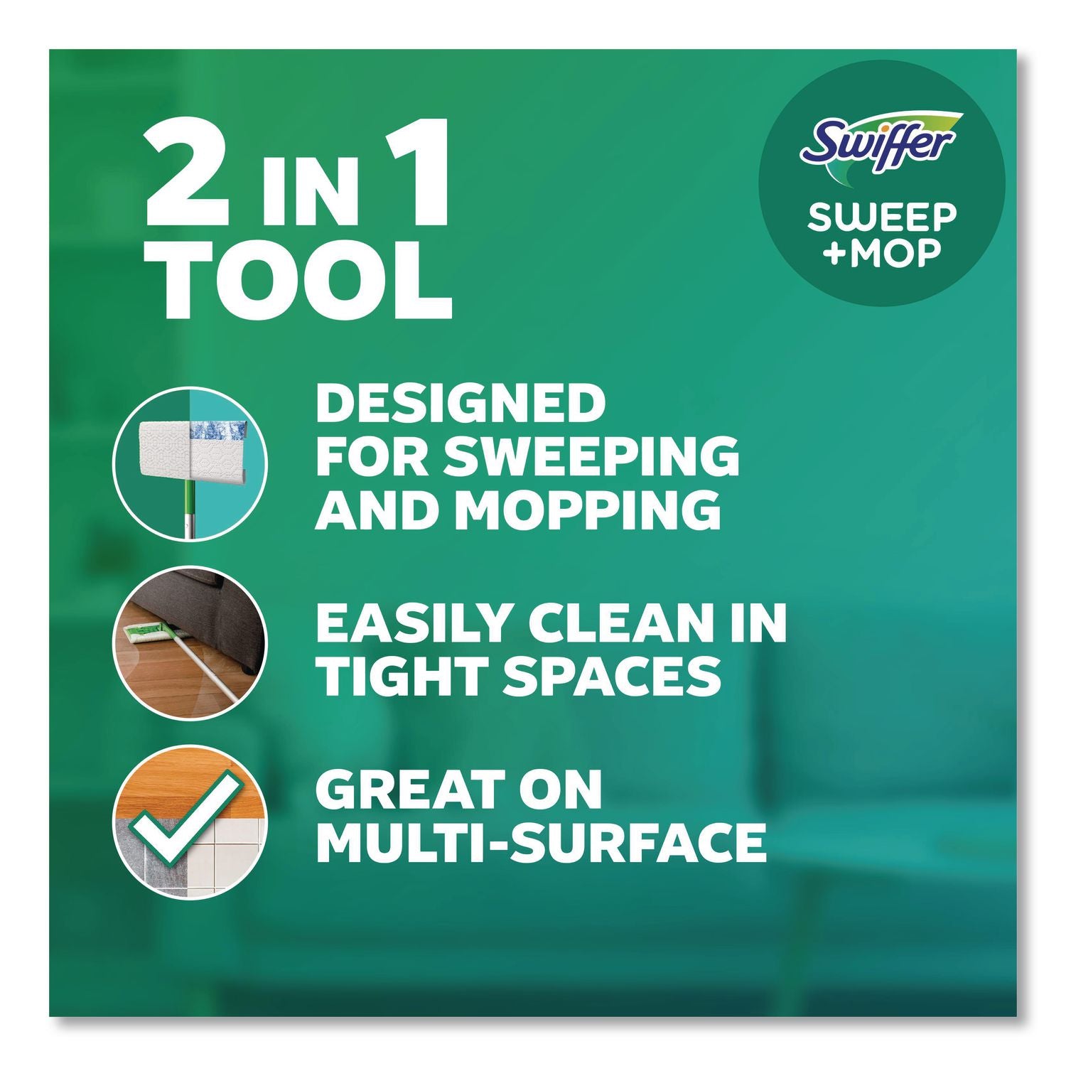 Swiffer® Sweep and Mop is a 2-in-1 multi-surface hard surface floor cleaner designed for both sweeping and mopping - no dustpan or bucket required! First, use a Dry Sweeping Cloth. With deep ridges and grooves that conform to the surface of your floor, TRAP + LOCK™ dirt, dust and hair. Next, use a Wet Mopping Pad to dissolve dirt and grime and trap it away, giving you an amazing clean. Enjoy the convenient combination of a broom and mop for a quick and easy clean that gets dirt out of your home once and for all. Refill cloths sold separately.