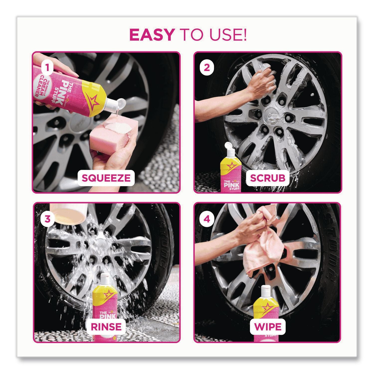 The Pink Stuff Miracle Cream Cleaner is a versatile and effective liquid cream cleaner for virtually all kinds of hard surfaces at home. A staple product in your stash of household cleaning products, this mild-abrasive cleaner is perfect for both indoor and outdoor use on surfaces such as grills, floors, walls, doors, ceramic, tiles, pots and pans, showers and sinks. It is amazing on tough stains, with endless usages and can be used on anything that will not scratch. Tough on stains yet gentle on surfaces, it is designed to handle some of the most stubborn stains and substances that other cleaners cannot, such as grease, grime and hard water stains. It penetrates and removes grease and grime, revives the dirtiest and saddest of looking items back to an incredible clean condition, and leaves surfaces satisfyingly clean, shiny and fresh with our signature Pink Stuff fresh fragrance. It is easy to use, simply use a small amount on a damp cloth or your chosen cleaning tool, scrub and wash away with clean water.