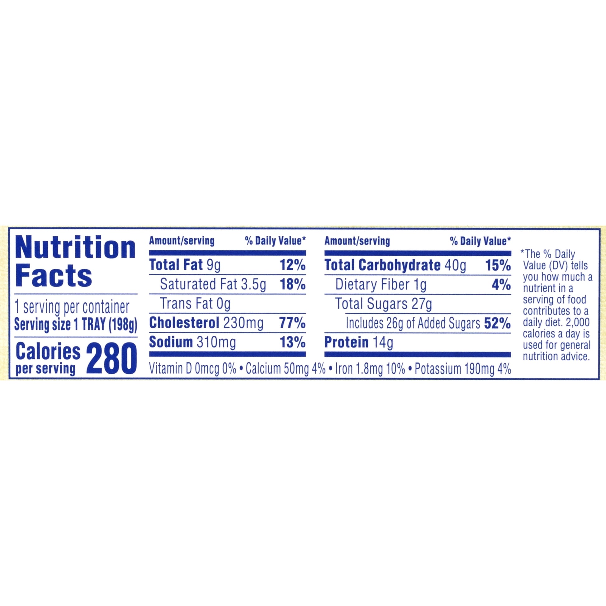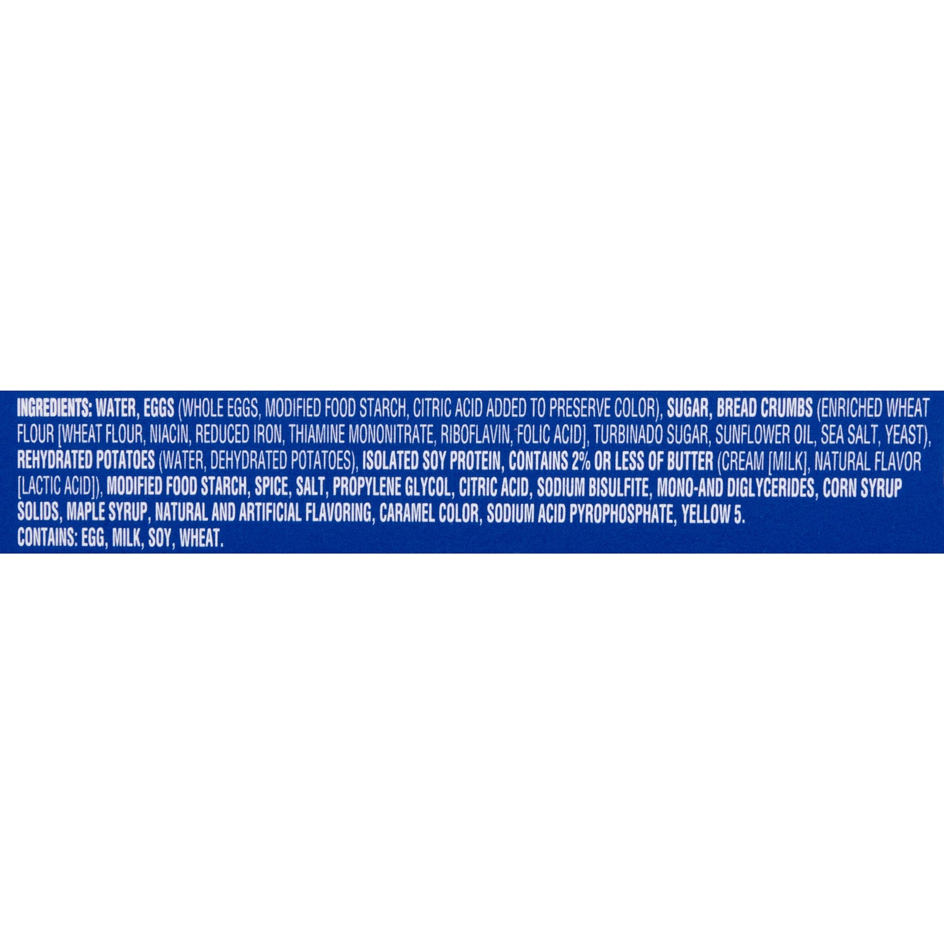 - Ingredients: Water, Eggs (Whole Eggs, Modified Food Starch, Citric Acid Added to Preserve Color), Sugar, Bread Crumbs (Enriched Wheat Flour [Wheat Flour, Niacin, Reduced Iron, Thiamine Mononitrate, Riboflavin, Folic Acid], Turbinado Sugar, Sunflower Oil, Sea Salt, Yeast), Rehydrated Potatoes (Water, Dehydrated Potatoes), Isolated Soy Protein, Contains 2% or less of Butter (Cream [Milk], Natural Flavor [Lactic Acid]), Modified Food Starch, Spice, Salt, Propylene Glycol, Citric Acid, Sodium Bisulfite, Mono-and Diglycerides, Corn Syrup Solids, Maple Syrup, Natural and Artificial Flavoring, Caramel Color, Sodium Acid Pyrophosphate, Yellow 5. CONTAINS: EGG, MILK, SOY, WHEAT