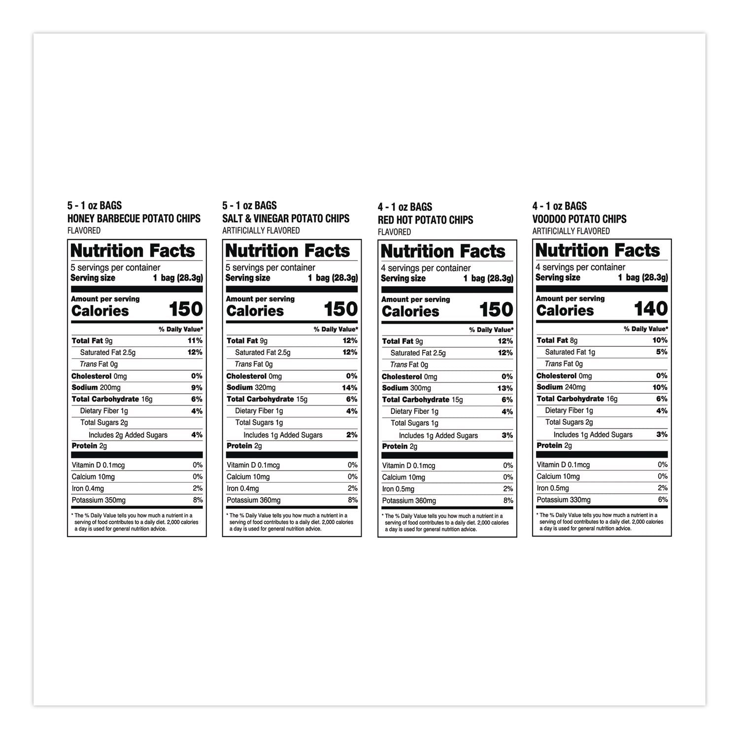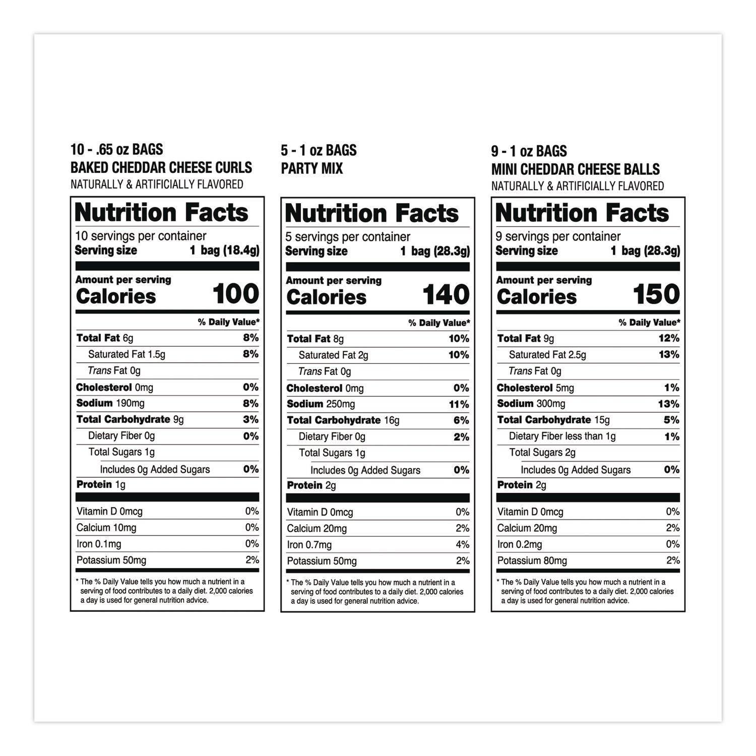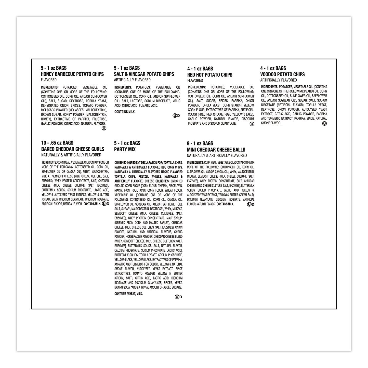 - Package Includes: (10) 0.65 oz Baked Cheddar Cheese Curls; (9) 1 oz Mini Cheddar Cheese Balls; (5) 1 oz Honey Barbeque Potato Chips; (5) 1 oz Party Mix; (5) 1 oz Salt & Vinegar Potato Chips; (4) 1 oz Red Hot Potato Chips; (4) 1 oz Zapp's Voodoo Potato Chips