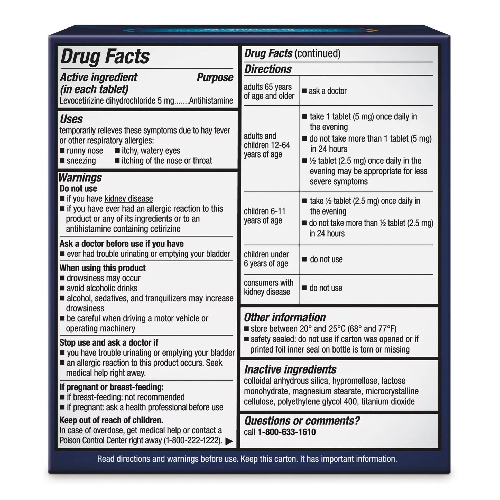 - There are 5 milligrams of levocetirizine dihydrochloride in a tablet; there are 35 tablets in a bottle – enough to get you through the worst of allergy season