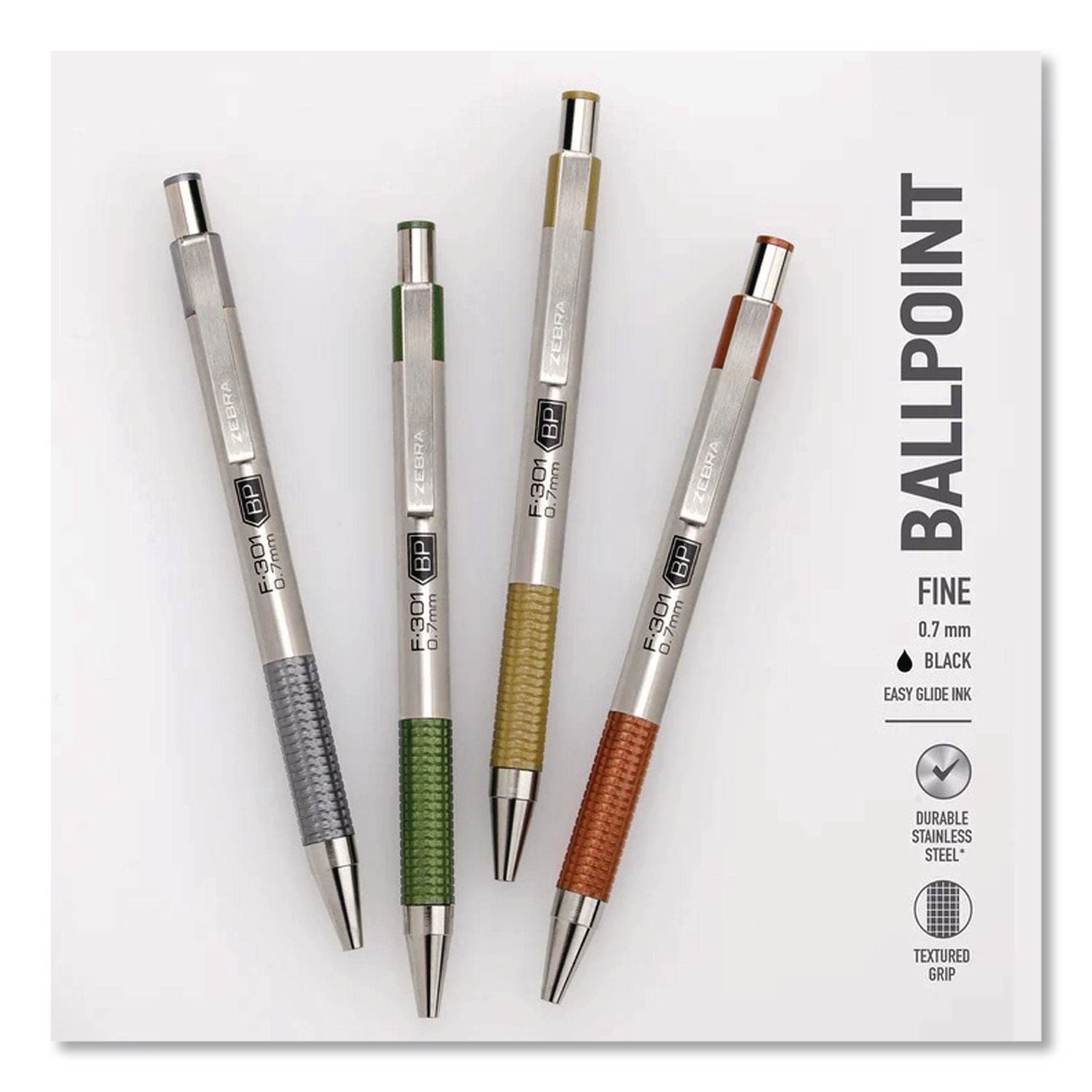 Zebra® F-301 Signature Series Earthy Tones Ballpoint Pen, Retractable, Fine 0.7 mm, Black Ink, Pewter Barrel, 4/Pack (ZEB27214)